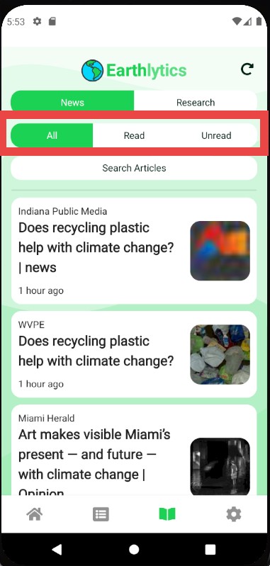 Upon navigating to the Publications page in the Earthlytics bottom navigation bar, you will land on the News page. The News page allows searching and will save any Read and Unread articles for easy access.